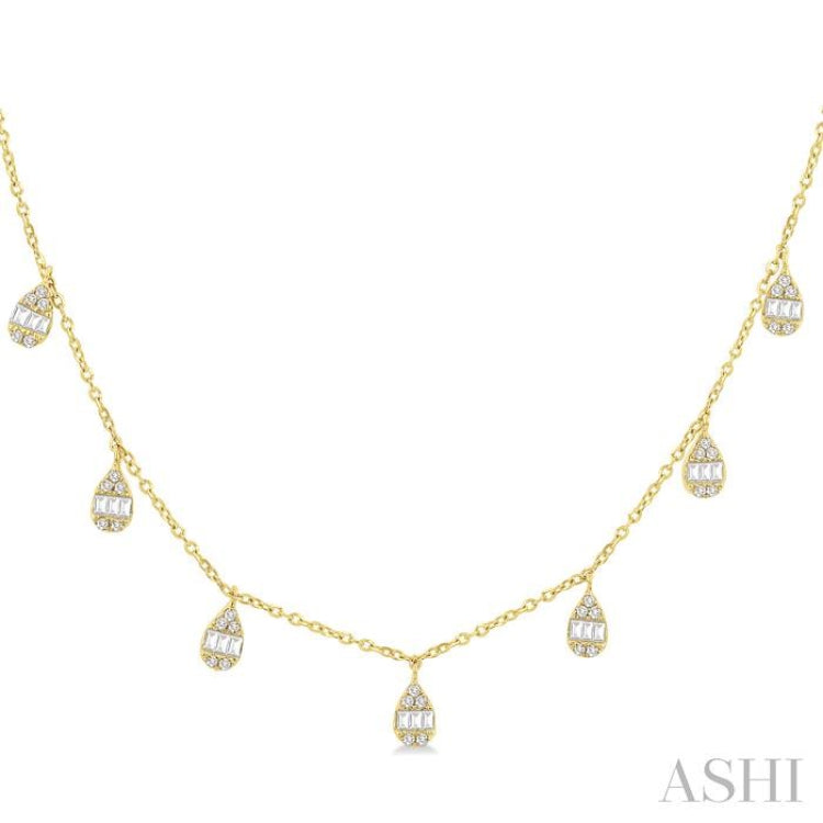 1/3 Ctw Pear Shaped Danglers Fusion Baguette and Round Cut Diamond Station Necklace in 10K Yellow Gold