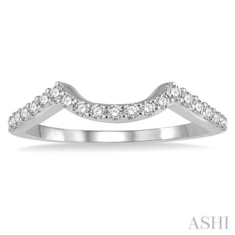 A charming diamond wedding band, this makes for a fine choice. With its niched center allowing it a neat fit along with mounted rings, the diamond band makes a sensible buy. The wedding band features a crescent shape center, which creates this convenient niche. A ring with a round, oval or pear shape mount can be easily slid beside it, fitting closely into the curved center. 21 prong set round cut diamonds decorate the wedding band, which is fashioned in a polished finish 14 karat white gold. Total diamond weight is 1/4 Ctw.